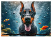 März: Dobermann taucht unter Wasser, neben ihm bunte Fische