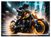 Futuristic bikes race through urban canyons and take the viewer in a fictional gaming world. Action-packed snapshots with explosions of colour show the abstractly drawn motorbikes in a modern city structure. The artworks were created in collaboration with artificial intelligence and refined to their final appearance by the calendar author.