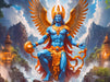 Garuda ist ein riesiger Vogelmensch, das Reittier (Vahana) Vishnus und Symbol göttlicher Geschwindigkeit und Kraft. Sein Körper ist muskulös, mit goldenen Federn, scharfen Klauen und Flügeln, die wie Sonnenstrahlen leuchten. Er wird oft im Flug gezeigt, wie er Schlangen bekämpft oder Vishnu auf seinem Rücken trägt.
