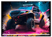 Futuristic off-road cars are roaring through urban canyons and take the viewer into a fictitious gaming world. Action-packed snapshots with explosions of colour displays the abstractly drawn cars in a modern city structure. The artworks were created in collaboration with artificial intelligence and refined to their final appearance by the calendar author.