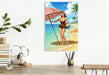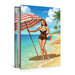 Betrachten Sie unsere bezaubernde Strand-Schönheit, die in einem stilvollen Bikini vor der Kulisse einer sonnigen Küste posiert. Jedes Detail dieser Illustration fängt die ikonische Ästhetik der 50er Jahre ein – von der klassischen Pose über den eleganten Schnitt des Bikinis bis hin zum verführerischen Augenzwinkern.