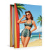 Betrachten Sie unsere bezaubernde Strand-Schönheit, die in einem stilvollen Bikini vor der Kulisse einer sonnigen Küste posiert. Jedes Detail dieser Illustration fängt die ikonische Ästhetik der 50er Jahre ein – von der klassischen Pose über den eleganten Schnitt des Bikinis bis hin zum verführerischen Augenzwinkern.