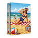 Betrachten Sie unsere bezaubernde Strand-Schönheit, die in einem stilvollen Bikini vor der Kulisse einer sonnigen Küste posiert. Jedes Detail dieser Illustration fängt die ikonische Ästhetik der 50er Jahre ein – von der klassischen Pose über den eleganten Schnitt des Bikinis bis hin zum verführerischen Augenzwinkern.