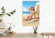 Betrachten Sie unsere bezaubernde Strand-Schönheit, die in einem stilvollen Bikini vor der Kulisse einer sonnigen Küste posiert. Jedes Detail dieser Illustration fängt die ikonische Ästhetik der 50er Jahre ein – von der klassischen Pose über den eleganten Schnitt des Bikinis bis hin zum verführerischen Augenzwinkern.
