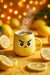 Ein gelber Becher mit finsterem Blick und dampfendem Zitronentee – umgeben von frischen Zitronenscheiben und warmem Licht sorgt dieses Motiv für Humor mit Zitrus-Kick.