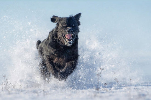 Mit voller Kraft voraus Mit voller Energie durchbricht der Riesenschnauzer das glitzernde Weiß des Winters. Schnee wirbelt auf, Muskeln spannen si...