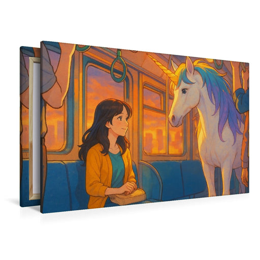 Premium Textil-Leinwand Frau begegnet im Zug einem Einhorn