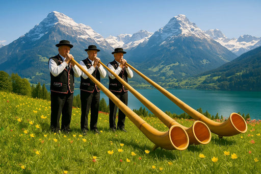 Kraftvoller Klang vor majestätischer Kulisse Ein Bild, das Schweizer Tradition lebendig werden lässt: Stolze Alphornbläser stehen auf einer blühen...