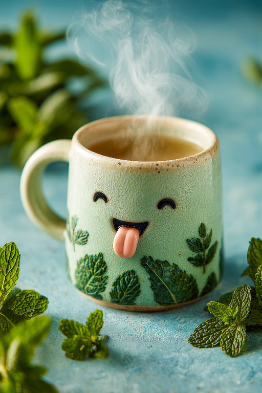 Ein dampfender Becher mit frechem Gesicht und Zunge – kombiniert mit frischer Minze, bringt dieses heitere Motiv gute Laune und Frische in Küche, ...