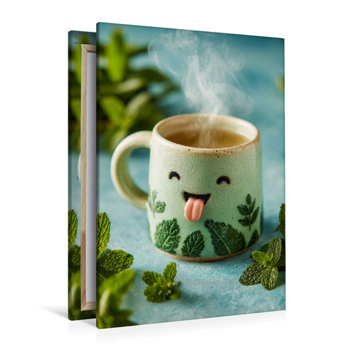 View full detailsPremium Textil-Leinwand Frecher Pfefferminztee streckt die Zunge raus - Lustiges Kräuter-Motiv