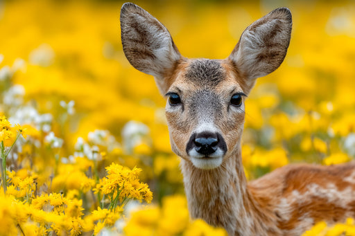 View full detailsPremium Textil-Leinwand Rehkitz im gelben Blütenmeer mit aufmerksamem Blick