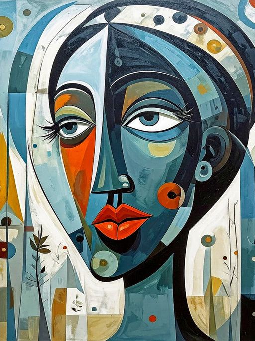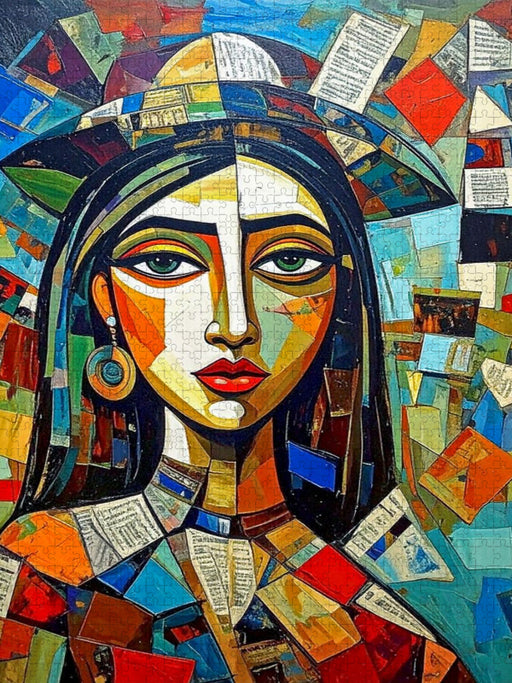 Porträt und Geometrie Das Bild von Rivka ist von der künstlichen Intelligenz nachempfunden dem Stil des Synthetischen Kubismus, der die Bildelemen...