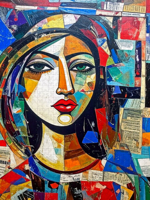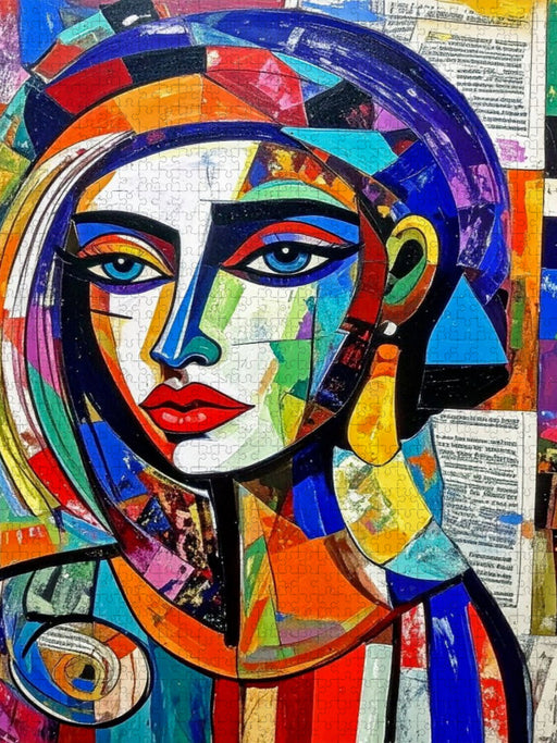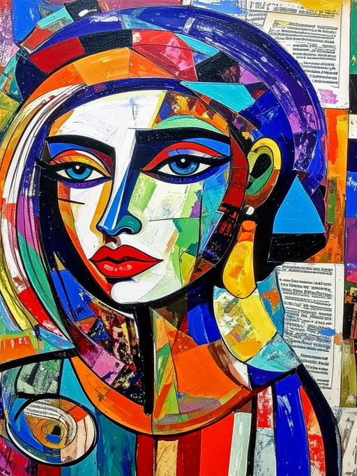 Porträt und Geometrie Das Bild von Naomi ist von der künstlichen Intelligenz nachempfunden dem Stil des Synthetischen Kubismus, der die Bildelemen...