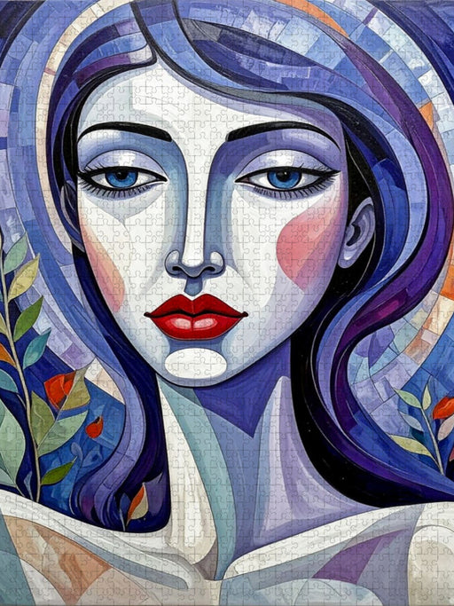 Porträt und Geometrie Das Bild von Jördis ist von der künstlichen Intelligenz nachempfunden dem Stil des Synthetischen Kubismus, der die Bildeleme...