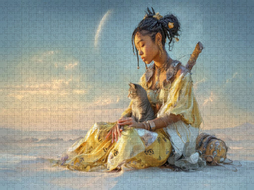 Junge Frau mit Katze Entdecken Sie die faszinierende Welt der anmutigen Menschen, stimmungsvoll und verträumt. Die KI-generierten Kunstwerke zeige...