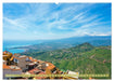 Januar: Altstadt von Castelmola mit Ausblick auf Bucht von Giardini Naxos, rechts erhebt sich der rund 3400 Meter hohe Vulkan Ätna, Sizilien, Italien