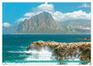 Juli: Nordwest-Felsenküste mit Brandung, im Hintergrund das Naturschutzgebiet Monte Cofano, Custonaci, Provinz Trapani, Sizilien, Italien
