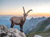 Ein stolzer und mächtiger Steinbock posiert hoch oben im Alpstein. Kurz vor Sonnenuntergang wirft der König der Alpen einen Kontrollblick über sein Königreich.