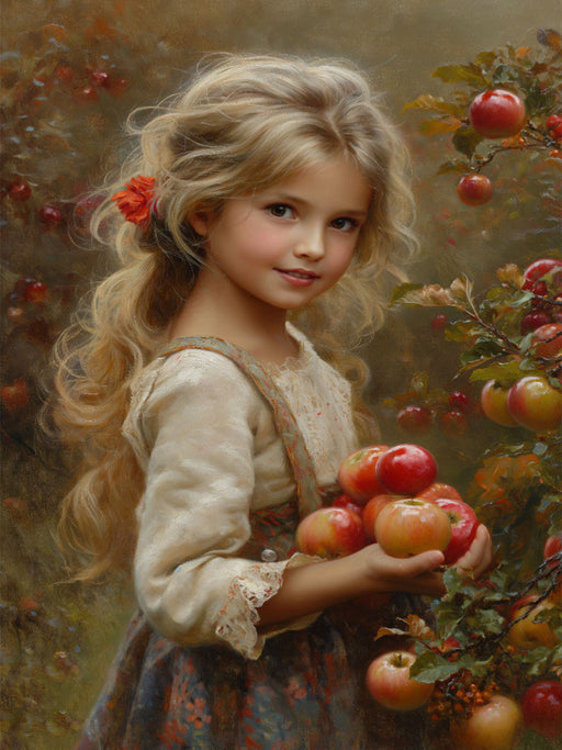 Ein blondes Mädchen und ihre Erntezeit Inmitten eines herbstlichen Apfelgartens erlebt ein kleines blondes Mädchen mit einem Strohhut magische Aug...