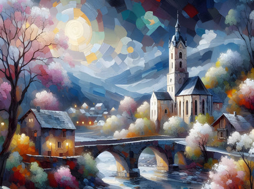 Nordwesteuropäische Landschaft einer alten Dorfkirche am Abend, mit Fluss und Steinbrücke, in einem Gemälde. Idyllische und verzauberte Atmosphäre...