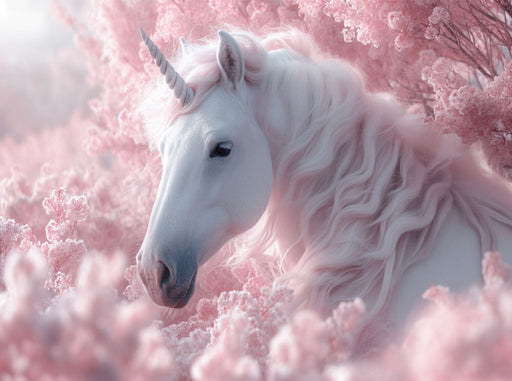 Ein mit künstlicher Intelligenz kreiertes Kunstwerk, das die Eleganz eines weißen Einhorns mit einer märchenhaften Kulisse aus rosa Kirschblüten v...