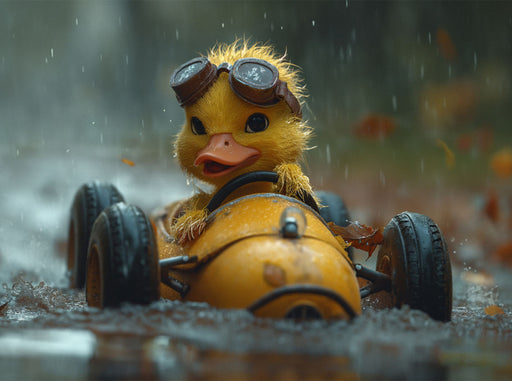Nasses Abenteuer im gelben Oldtimer Eine Ente mit Fliegerbrille steuert ein gelbes Vintage-Auto durch Regenpfützen – ein charmantes Rennen, das Sp...