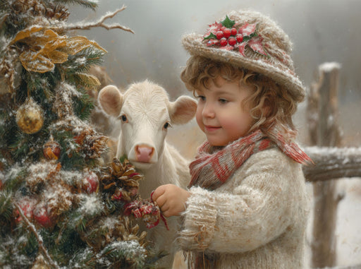 Ein Mädchen und ein Kuhkalb feiern Weihnachten am Weihnachtsbaum Ein kleines Mädchen im Wollpullover steht mit einem Kuhkalb an einem geschmückten...