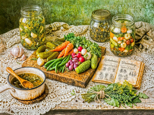 Hausgemüse im Einmachglas Dieses Motiv zeigt die liebevolle Welt traditioneller Handwerkskunst in einem nostalgischen Vintage‑Stil. Die detailreic...
