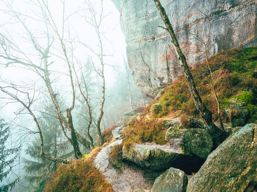 Neblige Pfade am Felsen Der Unterer Terrassenweg entlang der Elbe in der Sächsischen Schweiz verwandelt sich im dichten Nebel zu einem mystischen ...