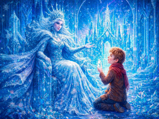 Im Reich aus Eis und Ewigkeit Im Schweigen des Winters erhebt sie sich die Schneekönigin, geboren aus Licht und Frost. Dieses KI-generierte Kunstw...