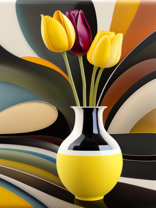 3 Tulpen als Strauß in einer schwarz gelben Vase Das Wandbild "Bunte Tulpen in einer stylischen Vase" ist ein absolutes Highlight für jeden Raum. ...