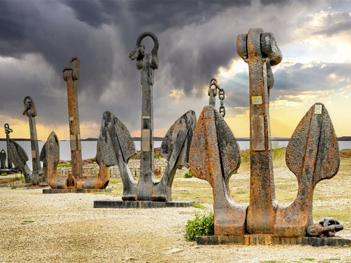 Sammlung historischer Schiffsanker in Les Tas de Pois Tosendes Meer, monumentale Leuchttürme, dunkle Felsen, einsame Inseln und charmante Hafenstä...