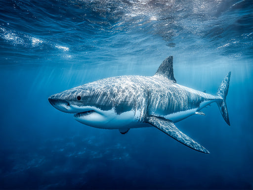 Mächtiger Weißer Hai im tiefblauen Ozean, faszinierendes Unterwassermotiv für Meeresliebhaber und Tierfreunde Ein Weißer Hai gleitet majestätisch ...