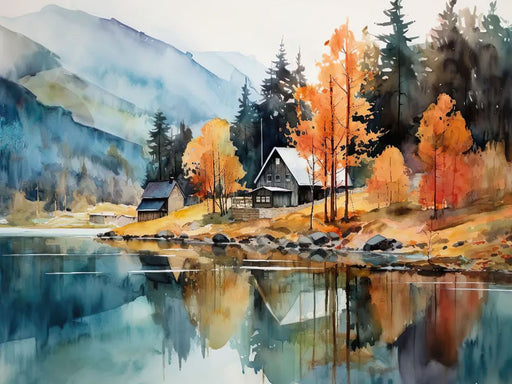 Herbstliche Landschaft am See Tauchen Sie ein in die bezaubernde Welt der Aquarellkunst mit unserer farbenfrohen Illustration einer idyllischen Se...
