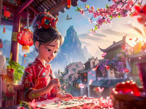 Ein Mädchen konzentriert sich auf die kunstvolle Kunst der chinesischen Kalligrafie. Mit ruhiger Hand zeichnet ein Mädchen kunstvolle Schriftzeich...