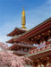 Eindrucksvolle fünfstöckige Pagode mit dem Hozomon Tor des Senso-ji-Tempels in Tokio. Die Gebäude erhebt sich majestätisch in den Himmel, ihre roten und goldenen Details leuchten im Sonnenlicht. Der blühende Kirschbaum zeigt eine Fülle von zarten rosa Blüten, die einen schönen Kontrast zu den kräftigen Farben der Tempelanlage bilden. Der Himmel ist klar, und die gesamte Szene strahlt Ruhe und kulturelle Schönheit aus.