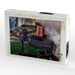 Die Szene ist voller Dramatik und Bewegung: Der Kontrast zwischen dem tiefen Schwarz der Kleidung, dem leuchtenden Braun des Koffers und dem kräftigen Grün des Waggons ist visuell spektakulär. Die Haltung, die Dampfschwaden und der dramatische Himmel vermitteln den Eindruck eines großen Abenteuers und einer Reise ins Ungewisse.