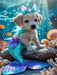 Das Märchen von der kleinen Meerjungfrau in neuer Gestalt: Ein Hundewelpe erscheint in der Unterwasserwelt, umgeben von Wasser, Licht und Stille. Ein Bild, das Märchenatmosphäre mit der Anmut eines Tieres verbindet.