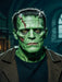 Frankensteins Monster ist eine riesige, grobschlächtige Kreatur mit grüner, narbiger Haut, die an zusammengeflicktes Leder erinnert. Sein kantiges Gesicht wird von tief liegenden Augen und groben Stichen gezeichnet, als wäre er aus verschiedenen Leichenteilen zusammengesetzt. Die stumpfen Haare und die wuchtigen Hände unterstreichen seine unnatürliche Herkunft.