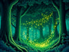 Ein dichter, dunkler Wald liegt in nächtlicher Stille, nur von tausenden synchron blinkenden Glühwürmchen erleuchtet – ihr Licht verteilt sich in rhythmischen Wellen über Lichtungen und zwischen Bäumen. Die Waldszene ist stilisiert mit klaren Konturen, tiefgrünen Schatten und zarten Lichtpunkten, die wie tanzende Sterne durch die Luft fliegen. Der Comicstil fängt die Magie und das Flirren dieses Naturphänomens mit atmosphärischer Tiefe und leichtem Glanz ein.