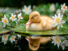 Ein flauschiges Entenküken ruht friedlich auf einem Seerosenblatt – umgeben von weißen Blüten und Spiegelung im Wasser entsteht ein märchenhaft stilles Puzzle-Motiv voller Anmut.