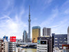 Urbane Impression mit dem Tokyo Skytree, der majestätisch in den Himmel ragt und das Stadtbild dominiert. Er ist ein architektonisches Meisterwerk und mit einer Höhe von über 600 Metern das höchste Bauwerk Japans. Seine markante Form macht ihn zu einem unverkennbaren Wahrzeichen der Skyline von Tokio. Um den Skytree herum erstreckt sich eine dichte Bebauung aus modernen Hochhäusern und traditionellen japanischen Gebäuden. Malerische Ansicht über die Dächer der Stadt.