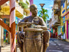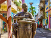 Mitten in den farbenfrohen Gassen von Pointe-à-Pitre auf Guadeloupe steht die lebensnahe Bronzestatue des Trommlers Velo – eine Hommage an die kulturelle Seele der Insel. Die Skulptur zeigt den Musiker beim Spielen seiner Trommel und ist Sinnbild für den karibischen Rhythmus und das musikalische Erbe der Region. Umgeben von bunten Häuserfassaden, Palmen und tropischem Flair vermittelt das Bild echtes Inselfeeling. Ein besonderes Fotomotiv, das nicht nur Kulturinteressierte anspricht, sondern auch als Wandbild farbliche Akzente setzt. Ideal für Liebhaber karibischer Musik, Straßenkunst und authentischer Urlaubserinnerungen.
