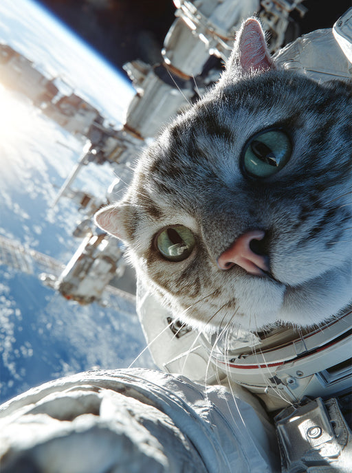Eine neugierige Katze im Raumanzug schwebt vor der Raumstation. Dieses lustige Sci-Fi-Motiv begeistert Kinder, Katzenfans und Familien gleichermaß...
