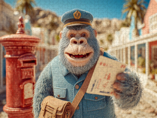 Ein fröhlicher Affe als Postbote in blauer Uniform mit Tasche, Brief und Mütze - perfekt für Kinder, die Tiere lieben und lustige Charaktere mögen...