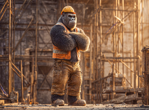 Ein muskulöser Gorilla als Bauarbeiter mit Helm, Arbeitskleidung und verschränkten Armen auf einer Großbaustelle. Für Kinder, die starke Tiere, Ba...