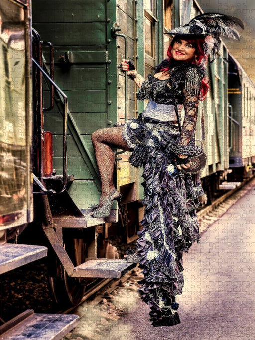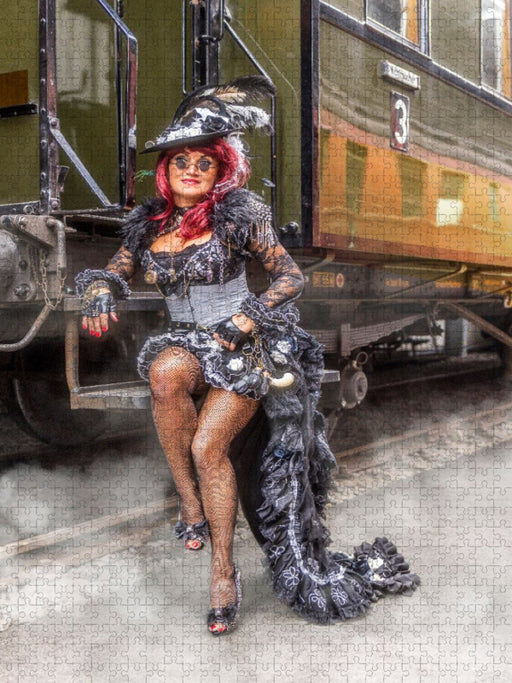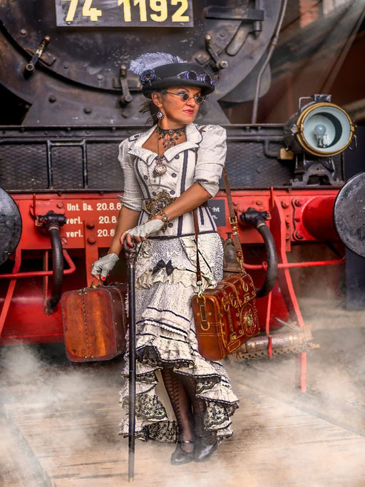 Reisebereit: Eine Lady trifft auf Dampf und viktorianische Eleganz. hre nächste große Reise beginnt hier! Dieses beeindruckende Foto fängt den Ge...
