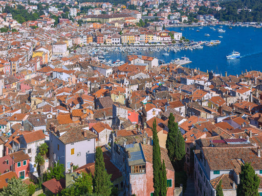 Altstadt und Hafen von Rovinj Ein mittelalterlich-venezianisches Stadtbild mit verwinkelten Gassen, eleganter Hafenpromenade und der barocken Basi...