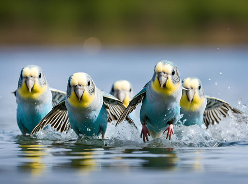 Wellensittiche beim Baden Niedliche und humorvolle Bilder von Tieren über und unter Wasser. Ein Badespaß der besonderen Art, die allen Betrachtern...