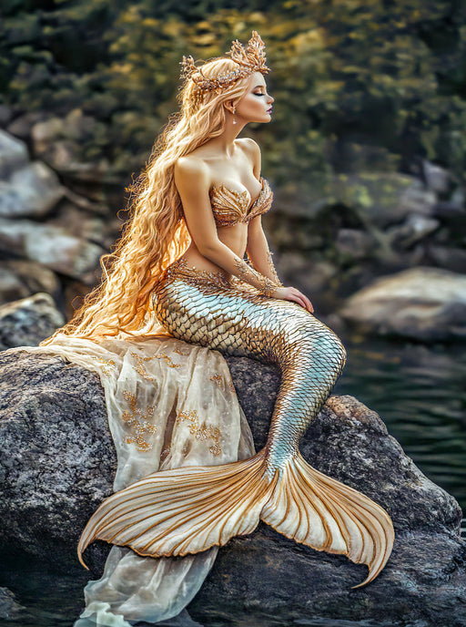 Dieses wunderschöne Motiv zeigt die kleine Meerjungfrau, wie sie sehnsüchtig auf einem Felsen sitzt und in die Ferne blickt. Die Illustration fäng...